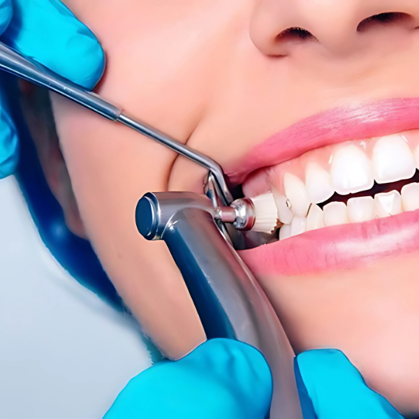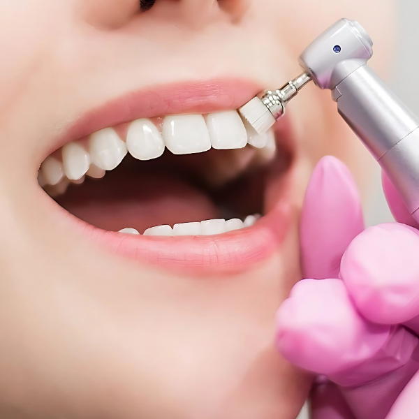 A soft rubber cup and polishing paste are used to smooth the teeth and remove minor stains.
